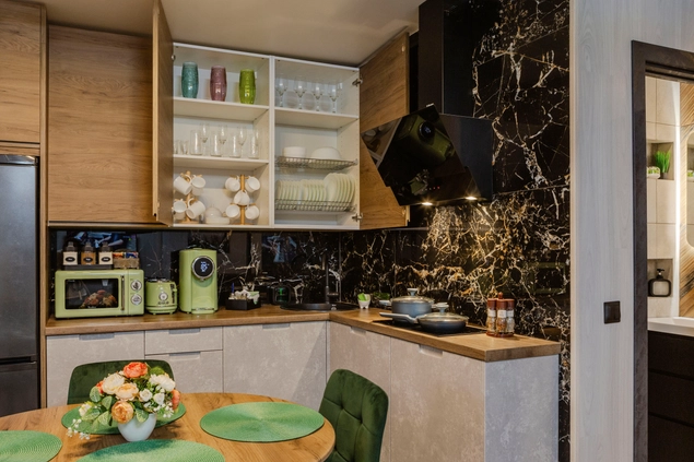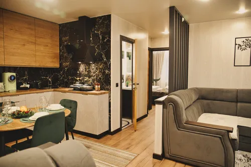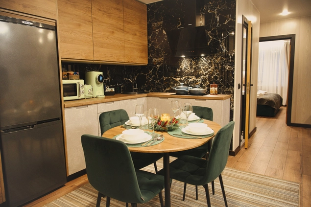 Очень уютные апартаменты с прекрасным интерьером. Заселение прошло без замедлений. В кухне есть всё, что нужно для приготовления пищи, включая микроволновку и стиральную машину. В ванной комнате новая сантехника. Всё работает, никаких проблем. Очень комфортно и удобно.