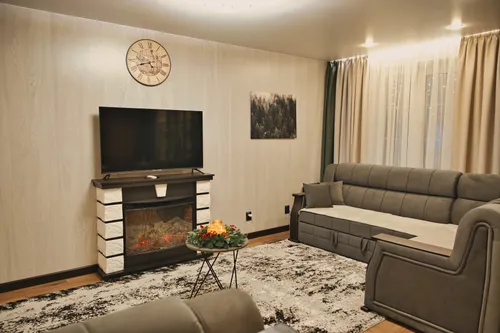 Удобная ночевка при поездке на север/с севера. Дом прямо рядом с трассой (удобно найти, но не шумно) Первый этаж Вход прямо с улицы минуя подъезд. Сам номер (квартира) ошеломляет контрастом с окружающим пейзажем. В простой панельке дизайнерский элегантный ремонт, вся бытовая техника, диваны, даже электрокамин. Рядом продуктовый магазин. На кухне нужный минимум продуктов типа чай/кофе/масло/соль/сахар. В нашем случае даже яйца в холодильнике. хозяева всегда на связи
